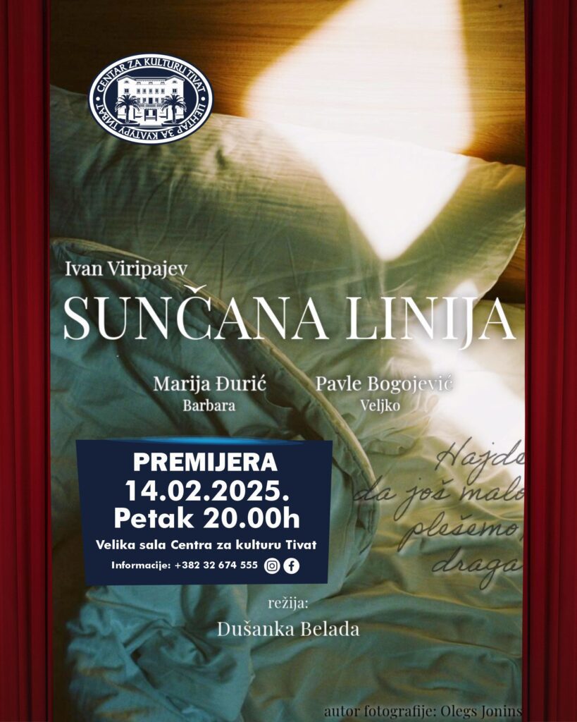 Sunčana linija je priča o ljubavi koja se sapliće o tišinu, o riječima izgovorenim prekasno ili prerano, o svemu što guramo pod tepih dok ne postane živo blato emocija. Barbara i Veljko, nakon sedam godina zajedničkog života, odlučuju da u jednoj noći rasprave sve ono o čemu su godinama ćutali. Ovo nije samo priča o braku – ovo je ogledalo naših slabosti, sebičnosti, strahova i strasti. Ovdje su komedija i tragedija nerazdvojni, baš kao što su nerijetko i ljubav i bol.
