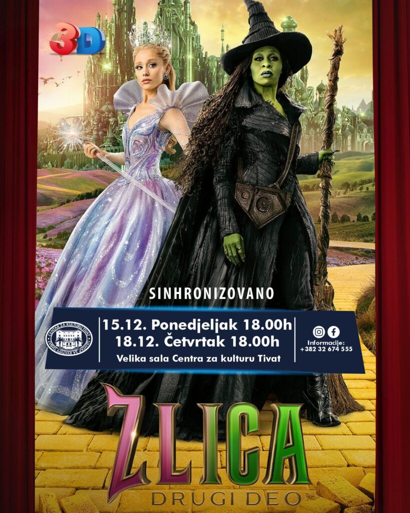 Prošlogodišnja filmska senzacija, koja je postala najuspješnija brodvejska filmska adaptacija svih vremena, sada dostiže svoj epski, uzbudljiv i emotivan završetak u filmu ZLICA – DRUGI DIO. Nagrađivani reditelj Džon M. Ču režira i nastavak, u kome takođe ponovo glumi spektakularna ekipa predvođena svjetskim zvijezdama nominovanim za Oskara Sintijom Erivo i Arijanom Grande. Imaćemo priliku da uživamo u posljednjem poglavlju neispričane priče o vješticama iz Oza i početku udaljavanja Elfabe i Glinde, koje moraju da žive sa posljedicama svojih izbora. Elfaba (Sintija Erivo), sada demonizovana kao zla vještica zapada, živi u izgnanstvu, skrivena u šumi dok nastavlja svoju borbu za slobodu ućutkanih životinja iz Oza i očajnički pokušava da razotkrije istinu koju zna o Čarobnjaku (Džef Goldblum). Za to vrijeme Glinda je postala glamurozni simbol dobrote cijelog Oza, živeći u palati u Smaragdnom Gradu i uživajući u blagodetima slave i popularnosti. Po uputstvu Madam Moribl (dobitnica Oskara Mišel Jeo), Glinda je dobila zadatak da služi kao blistava utjeha Ozu, uvjeravajući mase da je sve savršeno pod vlašću Čarobnjaka. Dok Glindina slava raste i dok se sprema da se uda za princa Fijera (dobitnik nagrade Olivije i nominovan za nagrade Emi i SAG, Džonatan Bejli) na spektakularnom vjenčanju u Ozu, proganja je razdvajanje od Elfabe. Ona pokušava da posreduje u pomirenju između Elfabe i Čarobnjaka, ali ti napori propadaju, što dodatno udaljava Elfabu i Glindu. Naknadni potresi će zauvijek promijeniti Boka (nominovan za nagradu Toni, Itan Slejter) i Fijera i ugroziti bezbijednost Elfabine sestre, Nesaroze (Marisa Bode), kada djevojka iz Kanzasa uleti u njihove živote. Dok se bijesna rulja diže protiv Zle Vještice, Glinda i Elfaba će morati da se udruže, poslednji put. Njihovo jedinstveno prijateljstvo koje je sada temelj njihove budućnosti i moraće zaista da pogledaju jedna u drugu, sa iskrenošću i empatijom, ako žele da promijene sebe i cio Oz, zauvijek. Glasovi SINHRONIZACIJA: Nevena Djoković, Branislava Podrumac, Marijana Vićentijević, Slobodan Stefanović, Đorđe Viktor Vlajić, Tatjana Dimitrijević, Vukašin Jovanović, Boris Lukman, Milica Burazer
